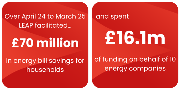 Since launching in 2015, LEAP has helped many energy suppliers meet their Warm Home Discount (WHD) obligations each year while working closely with local charities, authorities, and social housing providers. Over that time we have: